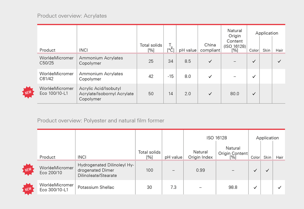 Both WorléeMicromer and WorléeMicromer Eco have different chemical compositions, such as acrylates, polyesters, or natural polymers, which leads to variations in their film-forming properties such as adhesion, water resistance, and stability of the formulations.