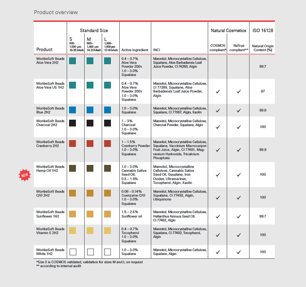 WorléeSoft Beads are visual particles in different sizes, colors and some are loaded with active ingredients. The particles were composed of mainly natural and renewable ingredients, are Non-GMO and can be used in leave-on or rinse-off products. WorléeSoft Beads are solid particles, which soften in aqueous formulations, as well as emulsions. They are also preservative free and do not contain animal components.